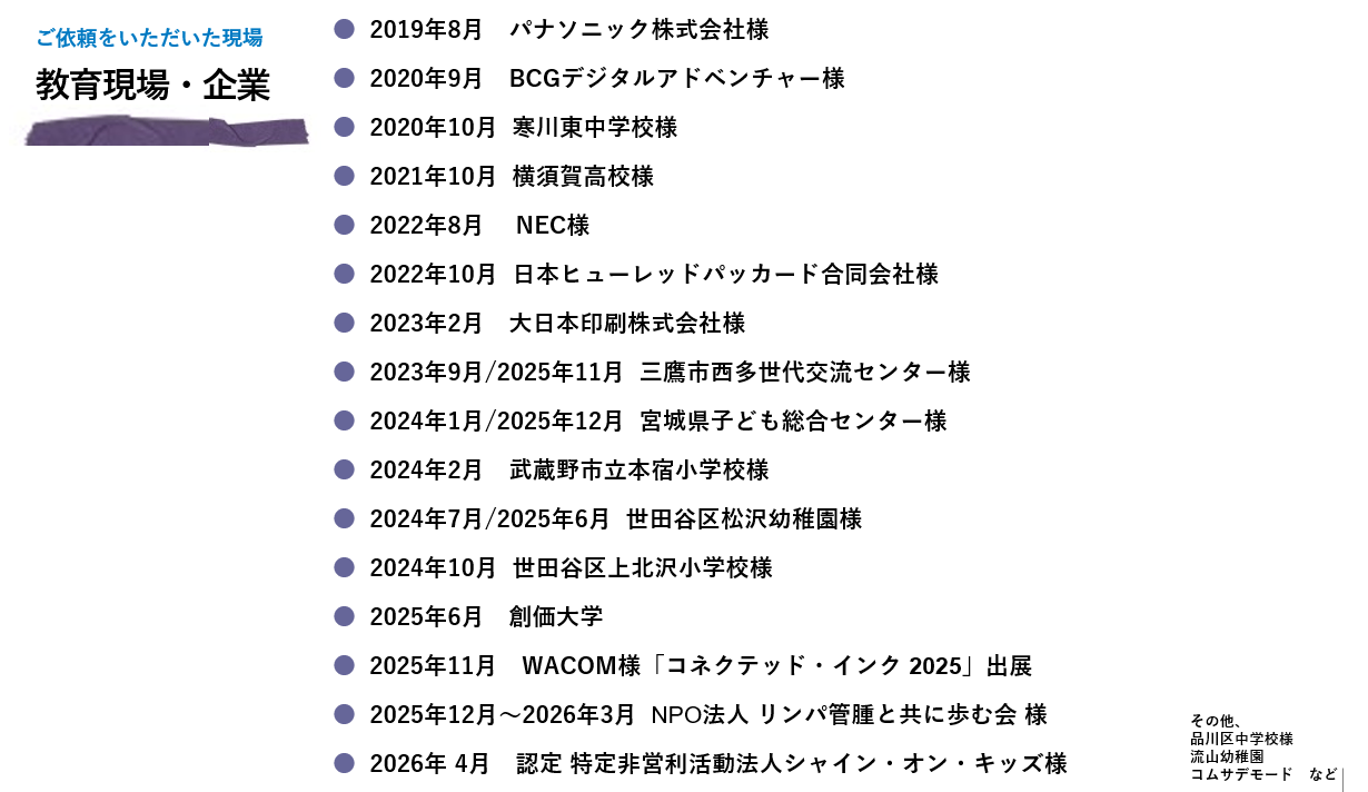 企業・医療機関・高齢者及び障がい者施設・教育関係機関、民間企業・行政など、目的に応じたプログラム立案やセラピスト派遣を行います。